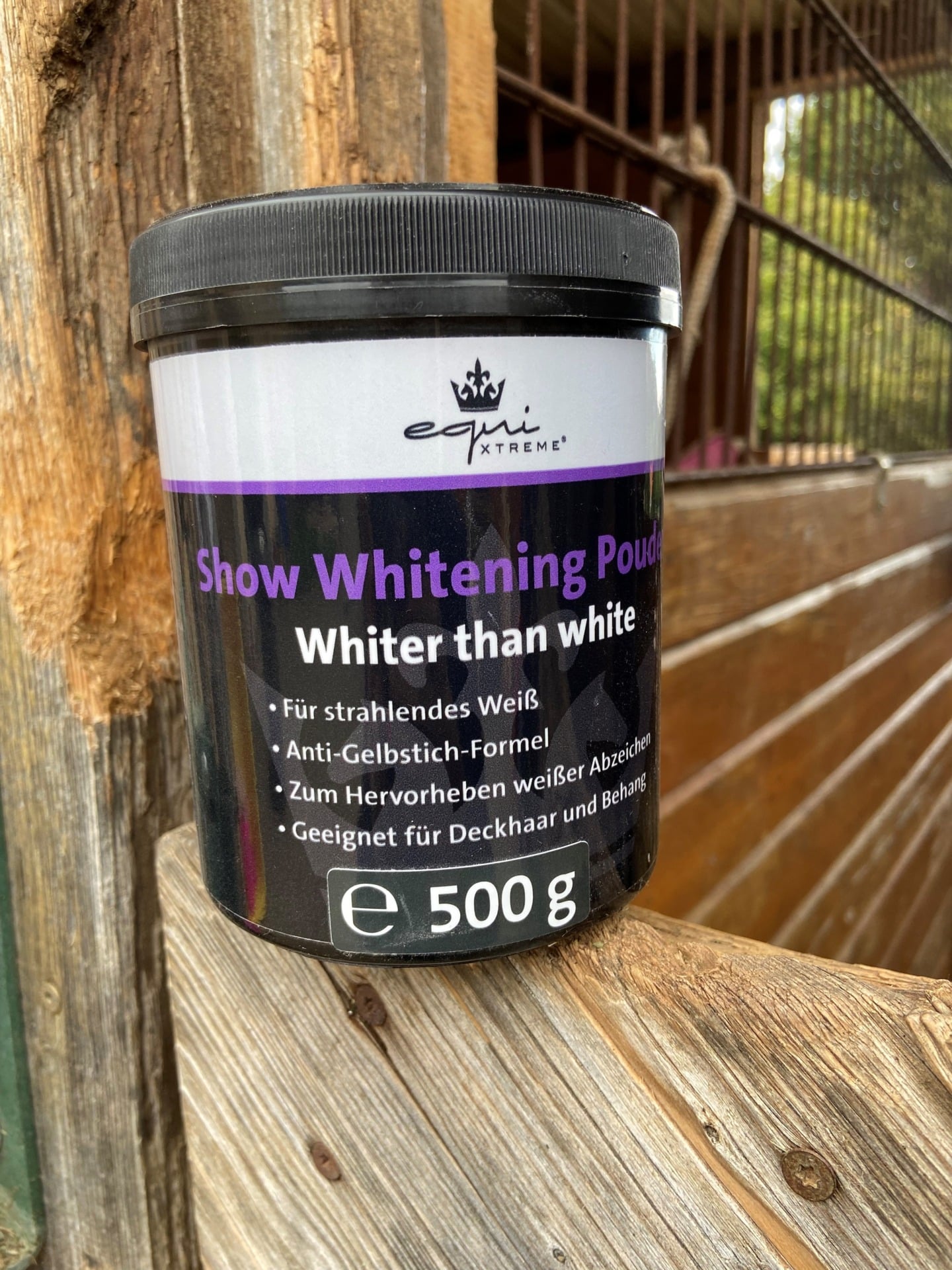 Hol Dir den ultimativen Showglanz für Dein Pferd mit dem equiXTREME Show Whitening Powder – für ein strahlend weißes Finish, das alle Blicke auf sich zieht.